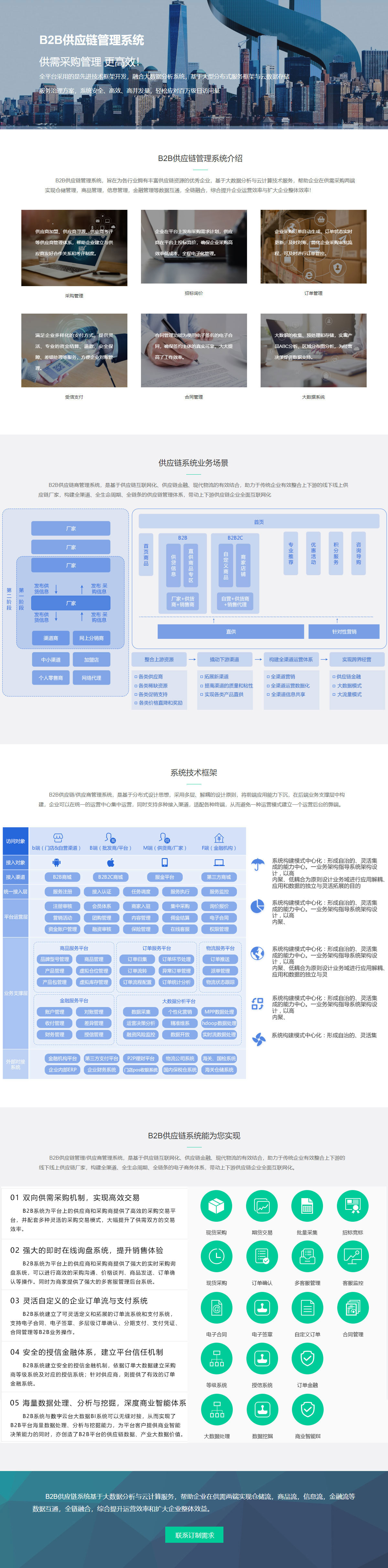 B2B供应链管理系统,旨在为各行业拥有丰富供应链资源的优秀企业,基于大数据分析与云计算技术服务,帮助企业在供需采购两端实现仓储管理,商品管理,信息管理,金融管理等数据互通,全链融合,综合提升企业运营效率与扩大企业整体效率!是基于供应链互联网化、供应链金融、现代物流的有效结合,助力于传统企业有效整合上下游的线下线上供应链厂家,构建全渠道、全生命周期、全链条的供应链管理体系,带动上下游供应链企业全面互联网化。B2B供应链/供应商管理系统,是基于分布式设计思想,采用多层、解耦的设计原则,将前端应用能力下沉,在后端业务支撑层中构建,企业可以在统一的运营中心集中运营,同时支持多种接入渠道,适配各种终端,从而避免一种运营模式建立一个运营后台的弊端。