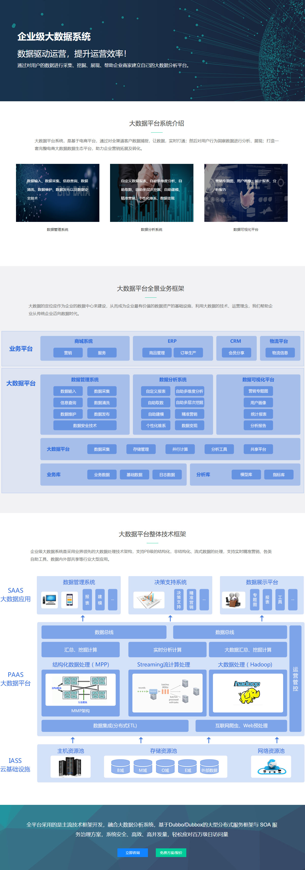 企业级大数据系统是采用业界领先的大数据处理技术架构,支持PB级的结构化,非结构化、流式数据的处理,支持实时精准营销、各类自助工具、数据内外部共享等行业大型应用。